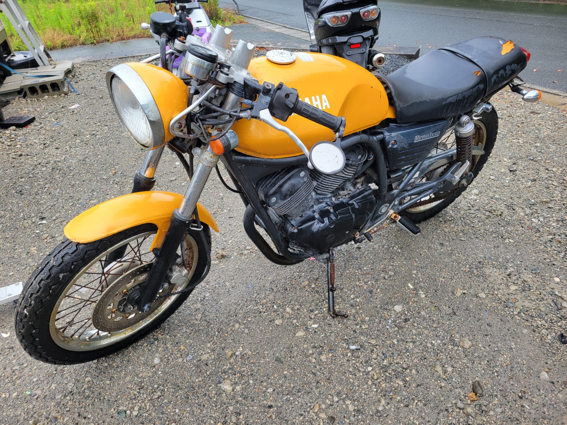 この長期間放置廃ネイキッドバイク(ルネッサ250キャブレタータイプ)は、長いこと乗ってないらしくて、今は濡れてるから綺麗に見えますが大分ボロいよって話されました(笑)